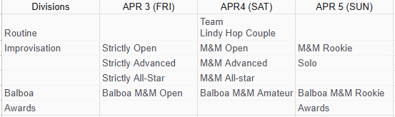 - ILHC, The Savoy Cup, Camp Hollywood, New Orleans Swing Dance Festival, Boston Tea Party, Camp Jitterbug, Lindy on the Rocks, Camp Swing It, The Snowball, European Swing Dance Championship, The Battle, Balkan Lindy Hop Championships(BLHC), Lindy Shock, or other competitions determined by the organizers.